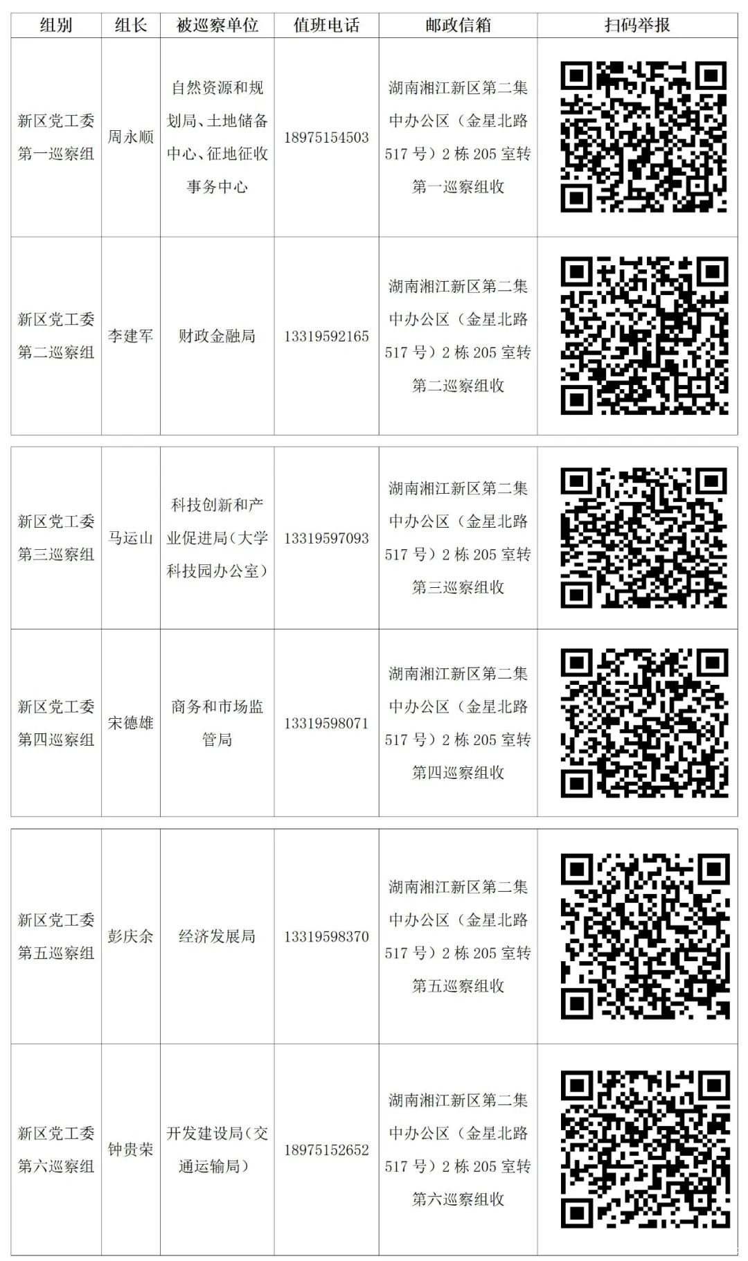 据悉,巡察组将在被巡察单位工作2个月左右时间。巡察期间设专门值班电话、邮政信箱、开通“码上巡察”信访二维码,主要受理反映被巡察党组织领导班子及其成员、下一级党组织领导班子主要负责人的来信来电来访,重点是关于违反政治纪律、组织纪律、廉洁纪律、群众纪律、工作纪律和生活纪律等方面的举报和反映。其他不属于巡察受理范围的信访问题,将按规定由被巡察单位和有关部门认真处理。欢迎广大干部职工、群众向新区党工委巡察组反映有关问题和情况。