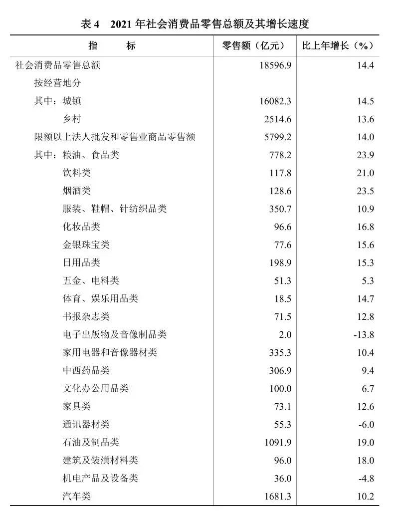 全年限额以上法人批发和零售业商品零售额5799.2亿元,比上年增长14.0%。分商品类别看,粮油、食品类零售额增长23.9%,化妆品类增长16.8%,家用电器和音像器材类增长10.4%,中西药品类增长9.4%,通讯器材类下降6.0%,石油及制品类增长19.0%,汽车类增长10.2%。绿色智能商品中,可穿戴智能设备零售额增长18.5%,智能手机增长17.6%,新能源汽车增长61.9%。