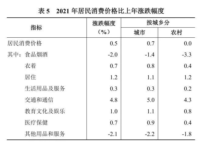 全年居民消费价格比上年上涨0.5%。其中,城市上涨0.7%,农村与上年持平。商品零售价格上涨1.6%。工业生产者出厂价格上涨5.9%,工业生产者购进价格上涨8.1%。农产品生产者价格下跌9.9%。