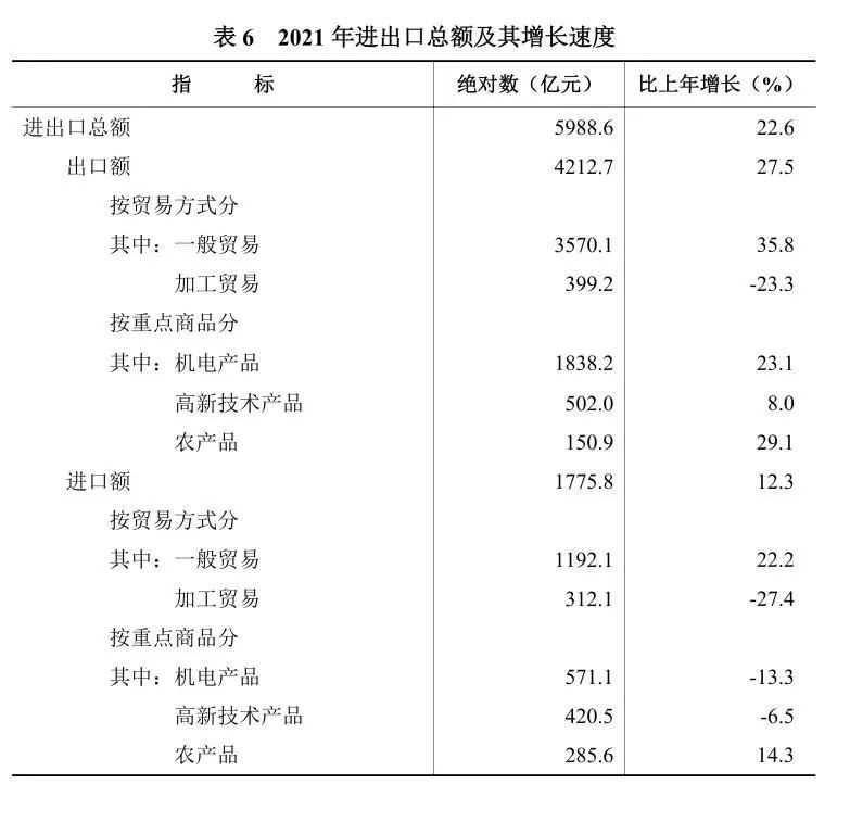 全年进出口总额[11]5988.6亿元,比上年增长22.6%。其中,出口4212.7亿元,增长27.5%;进口1775.8亿元,增长12.3%。分贸易方式看,一般贸易出口3570.1亿元,增长35.8%;加工贸易出口399.2亿元,下降23.3%。出口额居前五位的商品中,电子元件237.3亿元,增长38.2%;钢材226.4亿元,增长245.1%;服装及衣着附件197.5亿元,增长12.7%;鞋靴188.3亿元,增长51.7%;电工器材170.2亿元,增长52.7%。分产销国别(地区)看,出口美国726.9亿元,增长59.1%;出口香港519.1亿元,下降9.1%;出口欧盟[12]477.5亿元,增长33.7%;出口东盟713.0亿元,增长20.7%。