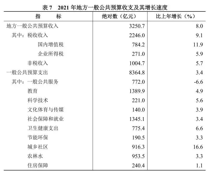 全年地方一般公共预算收入3250.7亿元,比上年增长8.0%。其中,税收收入2246.0亿元,增长9.1%;非税收入1004.7亿元,增长5.7%。税收收入中,国内增值税784.2亿元,增长11.9%;企业所得税271.0亿元,增长5.9%。一般公共预算支出8364.8亿元,增长3.4%。其中,教育支出1389.9亿元,增长4.9%;社会保障和就业支出1345.1亿元,增长3.4%;卫生健康支出775.4亿元,增长6.6%;科学技术支出221.0亿元,增长5.6%;住房保障支出240.4亿元,增长1.1%。