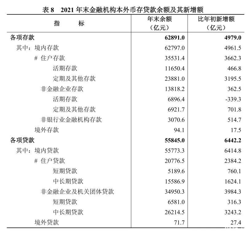 年末金融机构本外币各项存款余额62891.0亿元,比上年末增长8.6%。其中,住户存款余额35531.4亿元,增长11.5%;非金融企业存款余额13818.2亿元,增长2.7%。本外币各项贷款余额55845.0亿元,增长13.0%。其中,住户贷款余额20776.5亿元,增长13.0%;非金融企业及机关团体贷款余额34950.3亿元,增长12.9%。