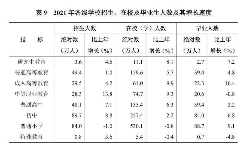年末有普通高校114所。研究生教育毕业生2.7万人,普通高等教育毕业生39.4万人,中等职业教育毕业生20.6万人,普通高中毕业生39.4万人,初中毕业生84.0万人,普通小学毕业生88.7万人。在园幼儿229.4万人,比上年下降0.9%。小学适龄儿童入学率[13]100%,高中阶段教育毛入学率[14]94.28%。各类民办学校10912所,在校学生261.4万人。发放高校国家奖学金、助学金(本专科生)13.0亿元,资助高校学生(本专科生)68.6万人次。发放中职国家助学金5.0亿元,资助中职学生50.3万人次。落实义务教育保障资金105.6亿元,发放普通高中国家助学金5.2亿元。